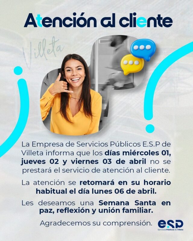 La Empresa de Servicios Públicos E.S.P. del municipio de Villeta informa a todos nuestros usuarios que la atención al cliente no se prestará los días miércoles 01, jueves 02 y viernes 03 de abril.